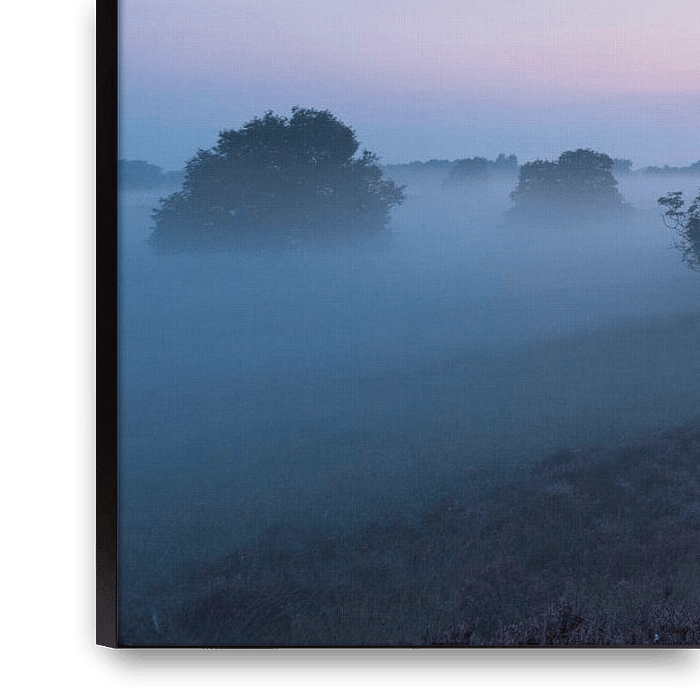 Eine halbe Stunde vor Sonnenaufgang in den Dünen Gasterse in Drenthe AA-Bereich. Die Heide in voller Blüte. Bodennebel und Pastelle in der Luft.