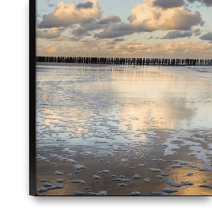 Bestelle das Foto Sonnenaufgang am Strand von Cadzand-Bad von John van de Gazelle fotografie als Reproduktion auf Leinwand, Alu-Dibond, als Poster, Fototapete oder Acrylglasbild.