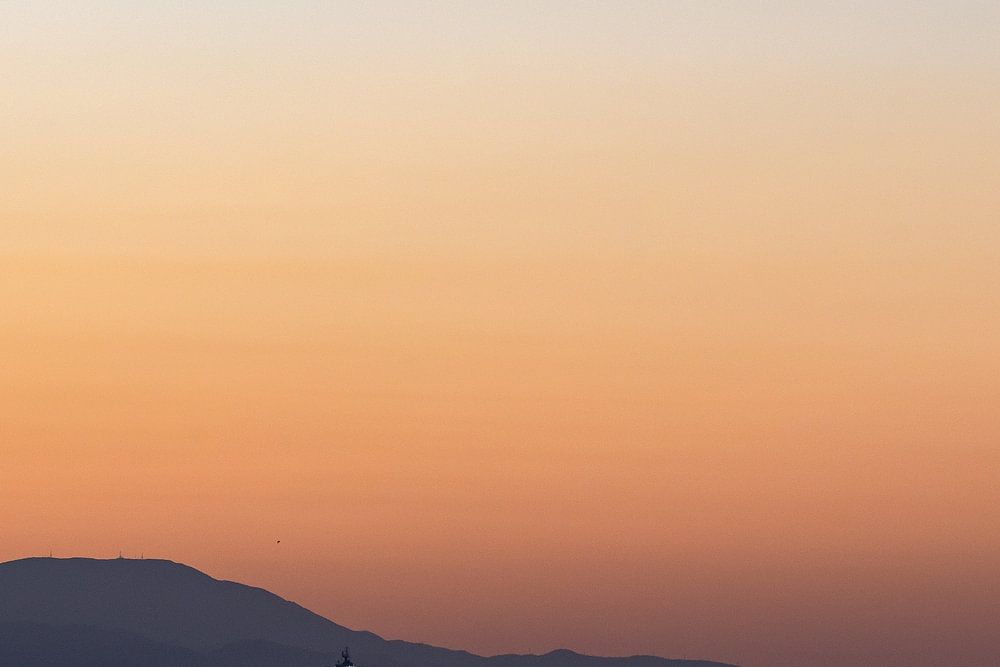 Frühmorgens vor Sonnenaufgang während der blauen Stunde am Strand von Málaga Südspanien Andalusien! Eine Silhouette der Berge, die ins Meer ragen!
