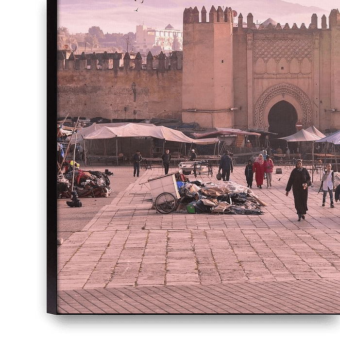 Bestelle das Foto Sonnenaufgang am mittelalterlichen Stadttor der Medina in Fez, Marokko von Romy Oomen als Reproduktion auf Leinwand, Alu-Dibond, als Poster, Fototapete oder Acrylglasbild.