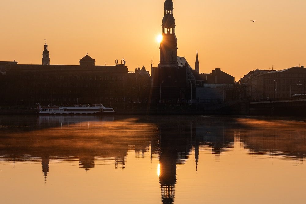 Die Sonne geht am Fluss Daugava hinter der St. Petrikirche auf. Sie gilt als Wiege der Reformation in Lettland und im gesamten Baltikum.