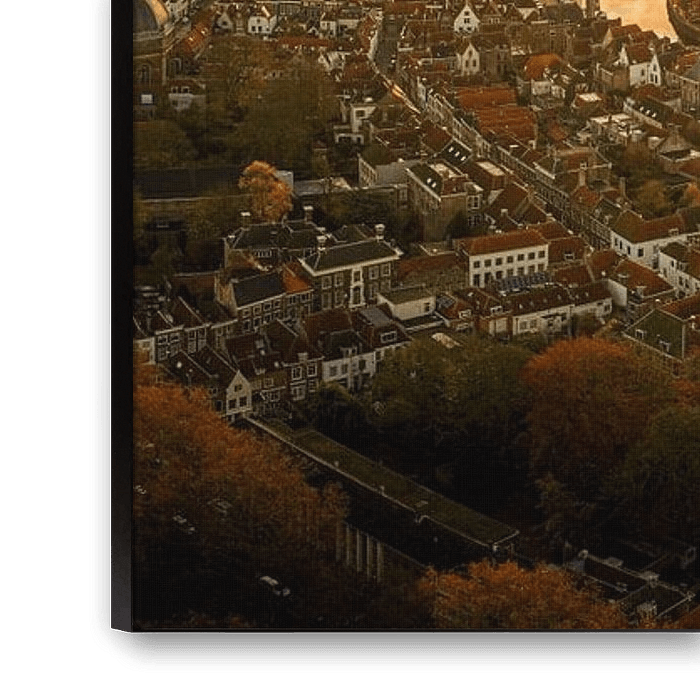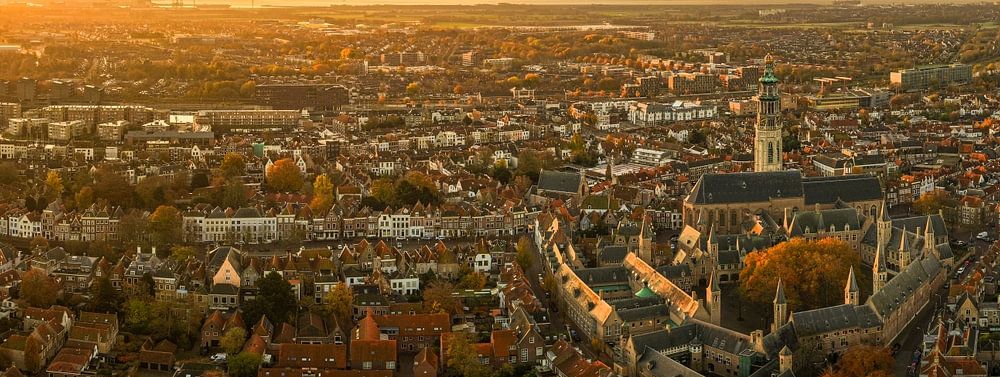 Mit meiner professionellen Drohne aufgenommenes Foto von Middelburg bei Sonnenaufgang. Es ist ein Panorama, das aus 325 Fotos zusammengestellt wurde. Das Licht fiel wunderschön auf den Langen Jan und die Abtei. Man kann auch von oben sehen, wie eine Stadt früher aussah und gebaut wurde.
