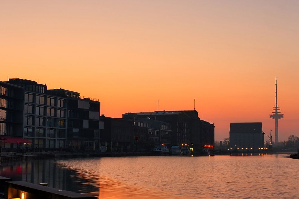Dieses Bild zeigt den Sonnenaufgang am Hafen in Münster.