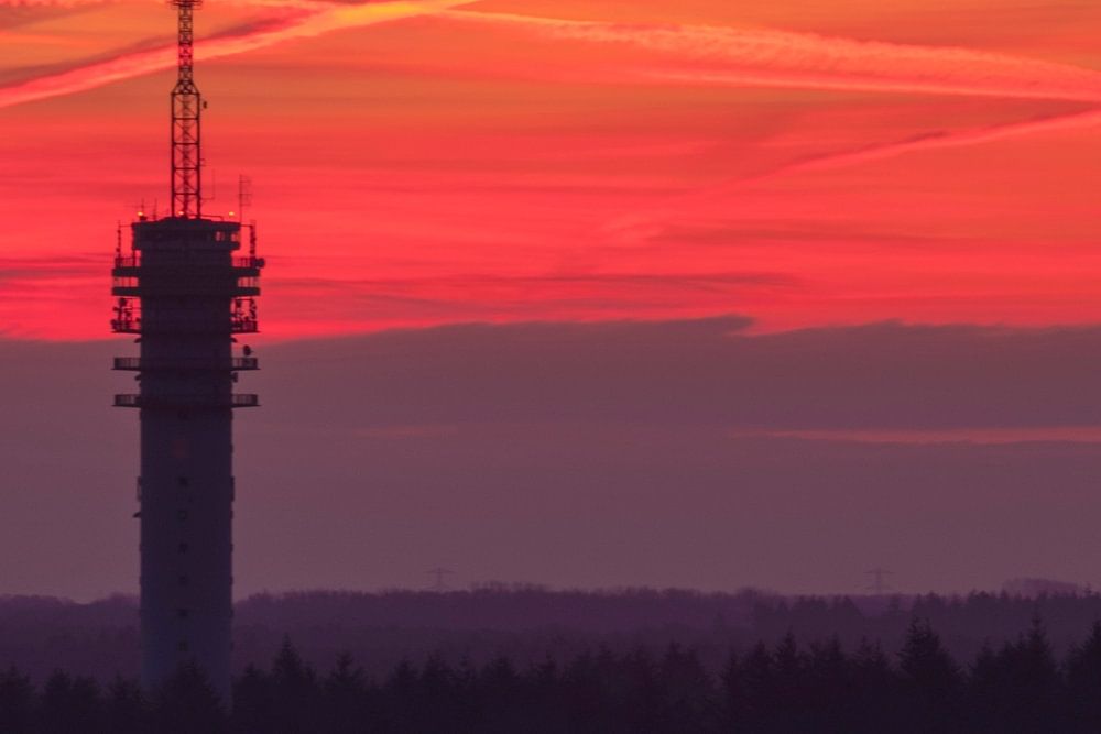 Ein roter Schein über dem Wald, mit einem deutlich markierten Turm: dem Fernsehturm von Mierlo in der niederländischen Provinz Nord-Brabant. Einige Streifen von Kondensation in der Luft. Nur die Profile der Baumkronen sind noch sichtbar.