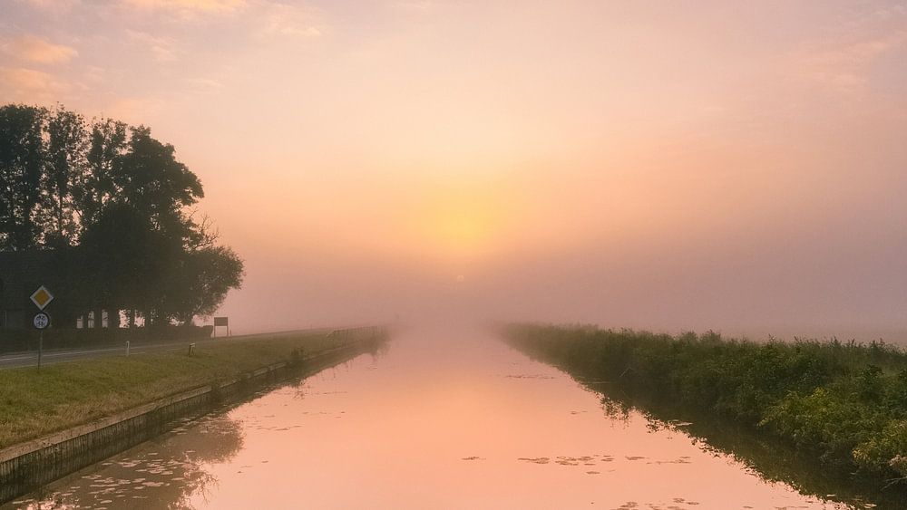 Sonnenaufgang an einem nebligen Morgen über Dedemsvaart, in der Nähe von Hasselt (Overijssel).