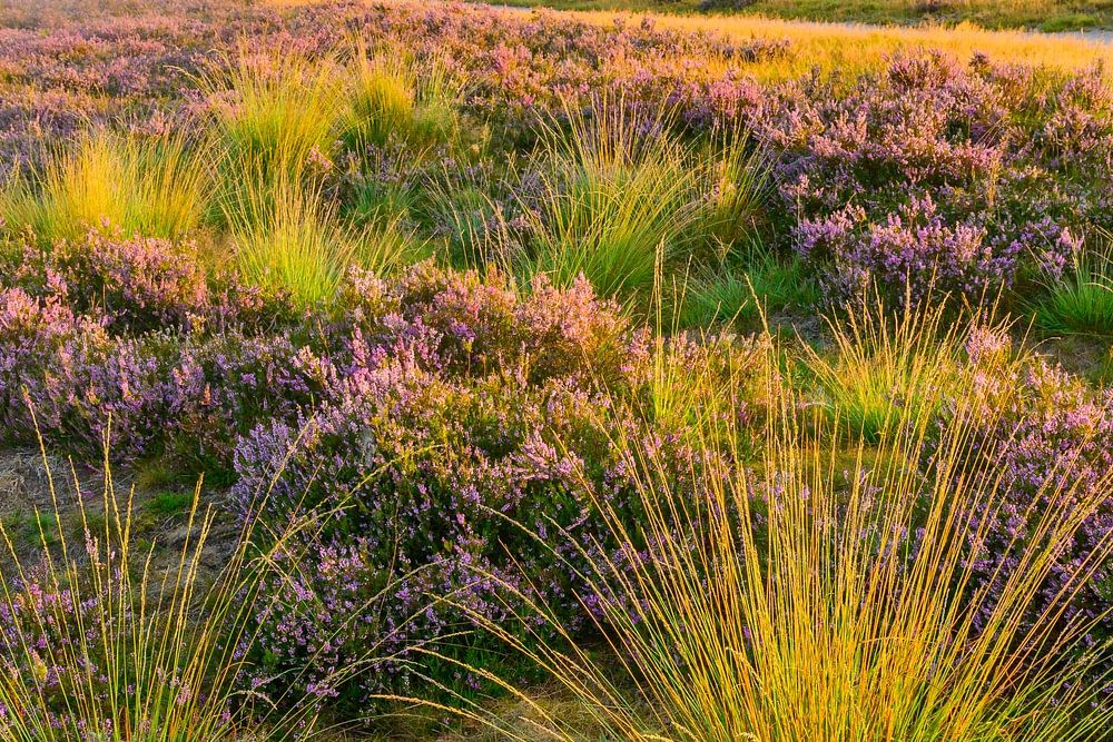 Sonnenaufgang über den blühenden Heidepflanzen (Calluna vulgaris) im Naturschutzgebiet Veluwe in der Heidelandschaft Renderklippen in Gelderland, Niederlande, während des Sonnenaufgangs. Zu Beginn dieses schönen warmen Sommertages steigt Nebel vom feuchten Boden auf.
