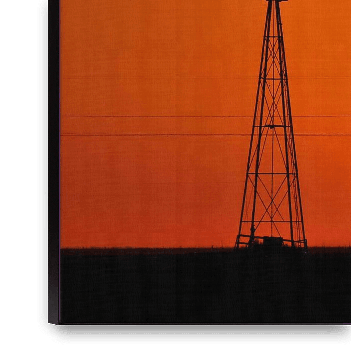 Ein Sonnenaufgang, der den Himmel über dem amerikanischen Texas, helle Orange erhellt, zusammen mit einer Windmühle, die typisch für diesen Bereich ist.