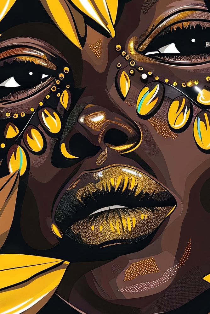 Dieses beeindruckende Kunstwerk zeigt das Gesicht einer Frau, umrahmt von leuchtenden Sonnenblumenblättern. Die intensiven Gelb- und Goldtöne kontrastieren wunderbar mit ihrer dunklen Haut, während die kunstvollen Details und die majestätische Präsenz der Frau eine fesselnde Aura schaffen. Diese Darstellung verbindet natürliche Schönheit mit künstlerischem Ausdruck und ist ideal für Liebhaber moderner, farbenfroher Kunst. Perfekt, um jedem Raum eine lebendige und inspirierende Note zu verleihen.