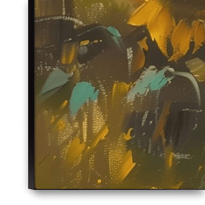 Dieses Werk zeigt ein Feld mit Sonnenblumen, das in das warme Licht der Sommersonne getaucht ist. Die Sonnenblumen stehen dicht beieinander, ihre großen gelben Blütenblätter strahlen in verschiedene Richtungen. Der Hintergrund ist dezent, mit Andeutungen von Grün und Blau, die die Helligkeit der Sonnenblumen verstärken. Dieses Werk…