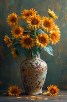 Elegantes Stillleben-Poster mit frischen Sonnenblumen in einer Keramikvase auf Holztisch vor strukturierter Wand.