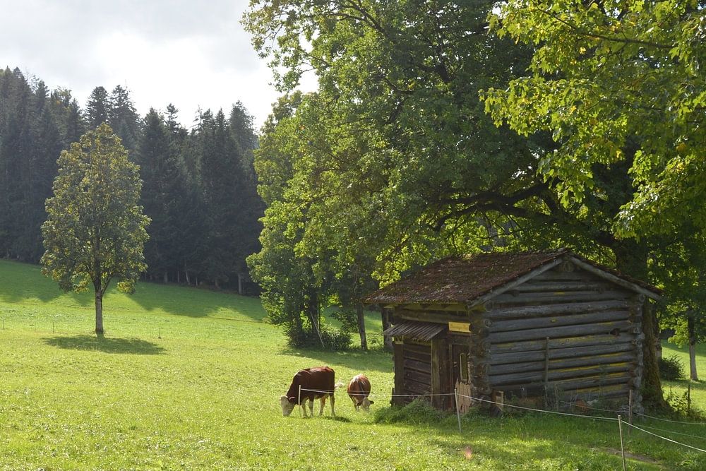 Begeben Sie sich mit „ "Sun-Drenched Alpine Meadow." “ mitten in die Tiroler Landschaft. Diese im österreichischen Dorf Söll aufgenommene Fotografie zeigt eine typische Szene ländlicher Harmonie. Eine traditionelle, verwitterte Blockhütte steht unter dem schützenden Blätterdach ausladender Bäume, während im Vordergrund…
