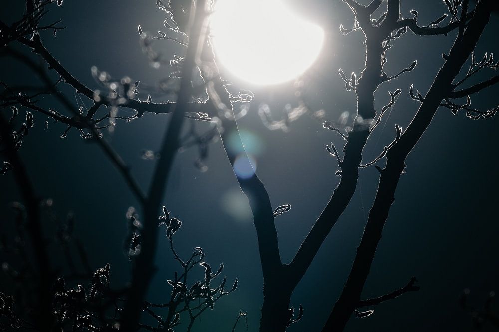 Dieses Bild zeigt die partielle Sonnenfinsternis vom 29. März 2025 inmitten von Bäumen. Das Licht der Sonne beleuchtet die Konturen der Äste. Abgesehen von dem hellen Licht der Sonne ist der Rest des Bildes dunkel, was für ein dramatisches Bild sorgt.