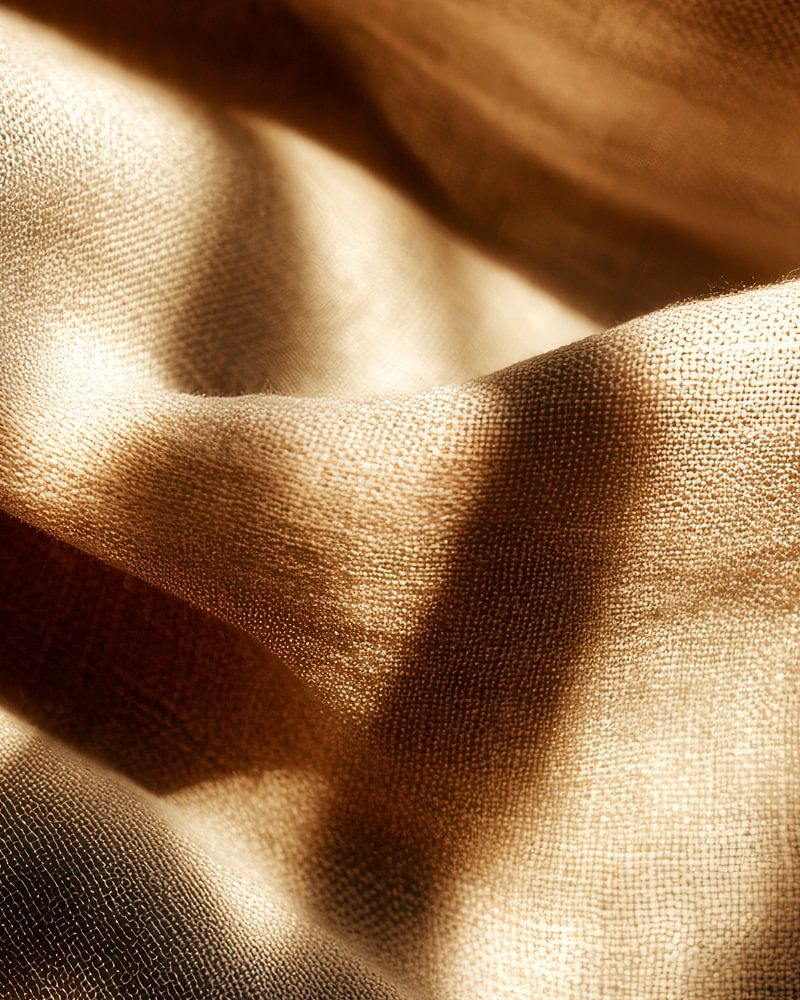 Dieses Bild zeigt einen Ausschnitt aus einem gefalteten Leinen-Baumwoll-Gewebe, auf das warmes Sonnenlicht scheint. Die Falten und Schatten erzeugen ein abwechselndes Muster aus Hell und Dunkel. Die Textur des Stoffes ist deutlich sichtbar und vermittelt ein Gefühl der Taktilität. Die Beleuchtung unterstreicht den natürlichen Glanz des Materials.