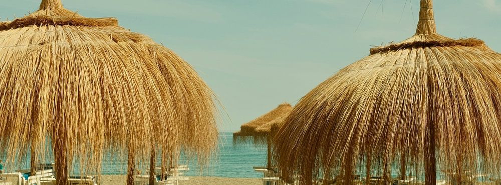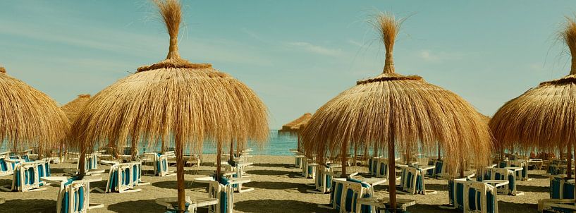Ein stimmungsvolles Panorama von Sonnenschirmen am spanischen Strand. Der Strand ist noch leer und wartet auf die Touristen, die im Sommer kommen werden.