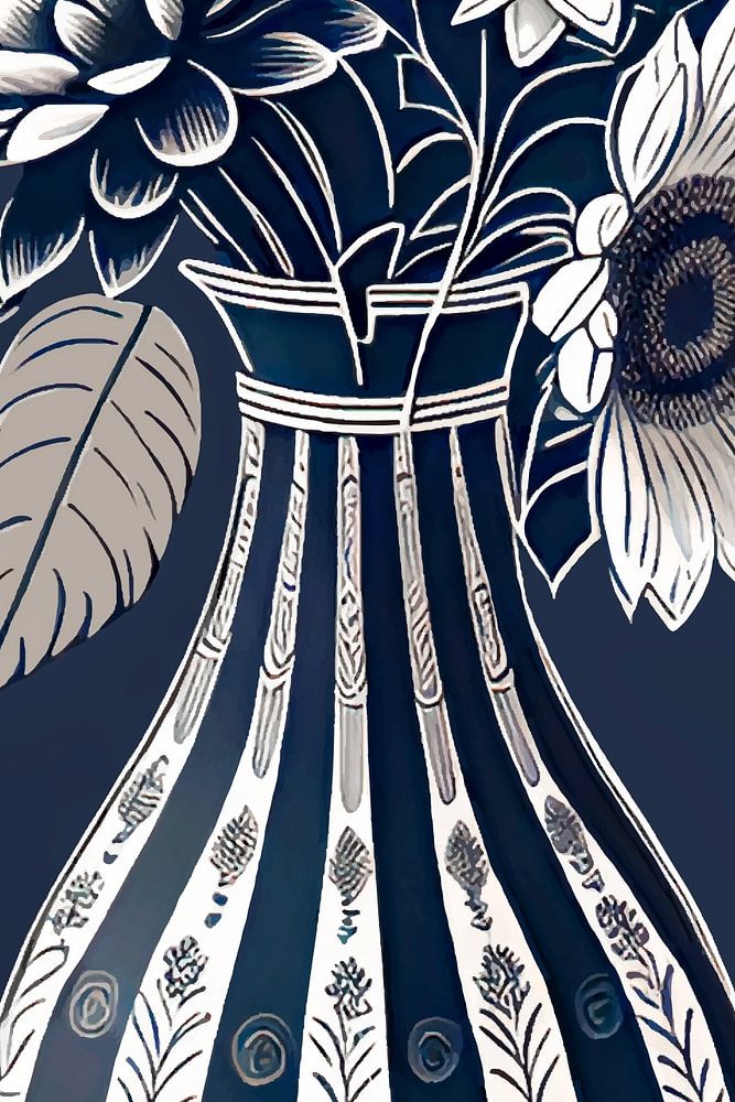 Das zentrale Element des Gemäldes ist die elegante Vase, die ein Gefühl von Raffinesse und Stil ausstrahlt. Mit ihren flachen und stromlinienförmigen Formen bildet die Vase einen perfekten Kontrast zu den schwebenden Blumen in ihrem Inneren. Die Sonnenblumen in ihrer vollen Pracht symbolisieren Vitalität, Freude und Wärme.