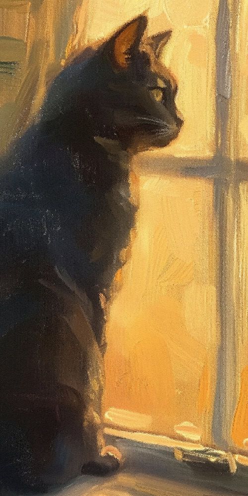 Eine schwarze Katze sitzt anmutig auf der Fensterbank, gebadet in den goldenen Sonnenstrahlen, die in den Raum fallen. Es herrscht ein Gefühl von Frieden und Wärme, während die Katze die Welt draußen beobachtet.