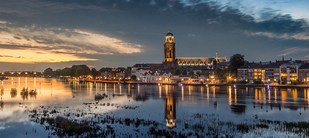 Skyline von Deventer und der IJssel bei Sonnenuntergang und Ebbe