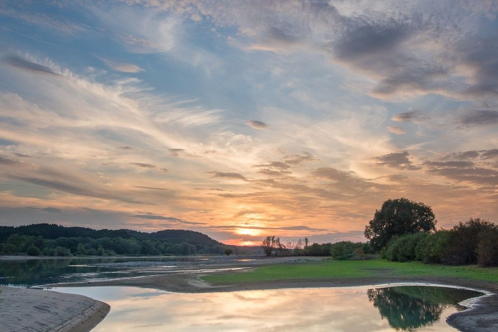 Sonnenuntergang Elbe in Deutschland mit Flare von Wolken und Reflexion des Himmels