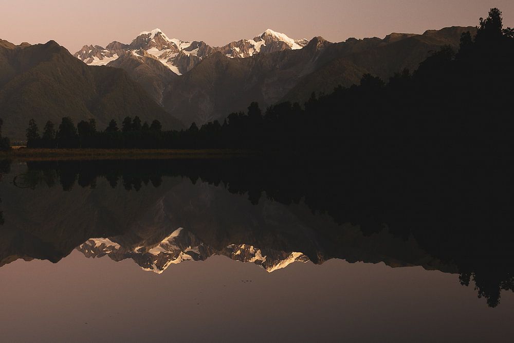 Eine der meistfotografierten Landschaften auf der Südinsel Neuseelands: der Matheson-See. Der See befindet sich in der Nähe des Dorfes Fox Glacier, in der Nähe des Gletschers. An einem klaren Abend und bei Windstille kann man das spektakuläre Spiegelbild der Berge Aoraki/Mount Cook und Mount Tasman sehen. Ich hatte Glück, das Wasser hatte keine einzige Welle. Sie können um den See herumgehen und es gibt mehrere Aussichtspunkte. Dieses Bild wurde vom Steg aus aufgenommen. Hier haben Sie die beste Aussicht. Und die Stechmücken und Sandfliegen leisten Ihnen Gesellschaft.