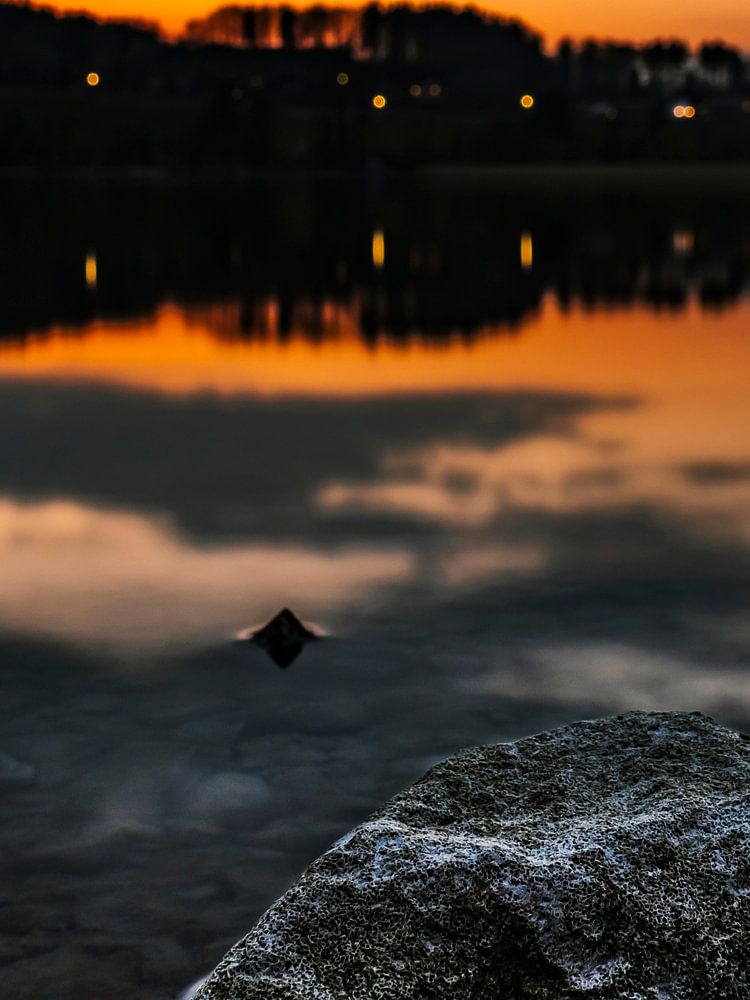 Sonnenuntergang am See mit einem Stein im Vordergrund.