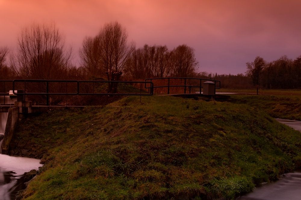 Sonnenuntergang an der Fischtreppe Woolde in Hengelo mit Wasser, das durch eine lange Verschlusszeit verschmiert wurde.