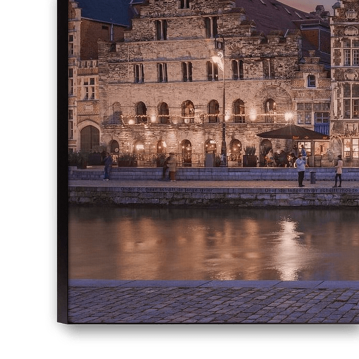 Sonnenuntergang an der Korenlei in der belgischen Stadt Gent. Die an der Leie gelegene Korenlei war bis ins achtzehnte Jahrhundert das Zentrum des Genter Hafens.