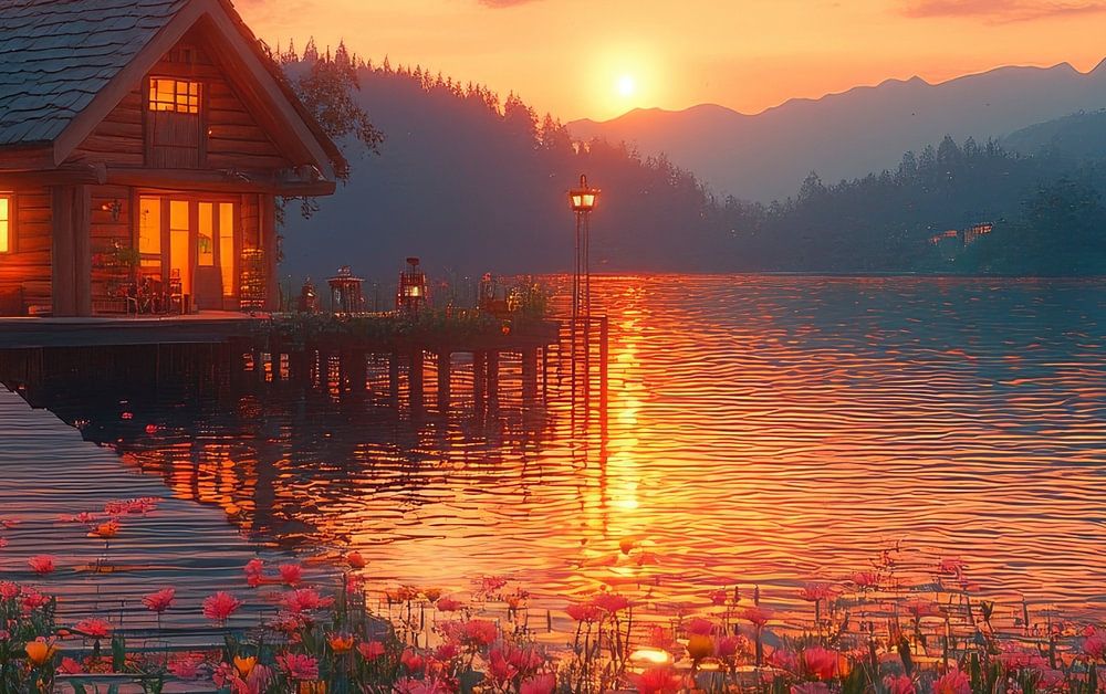 Treten Sie ein in einen Traum, in dem die goldenen Farbtöne des Sonnenuntergangs auf die pulsierenden Blüten der Natur treffen. Diese gemütliche Hütte am See, umgeben von bunten Blumen und friedlichen Gewässern, lädt Sie ein, die Ruhe und die Schönheit des Augenblicks zu genießen. Perfekt für Liebhaber von ruhigen Fluchten und warmen Schwingungen.