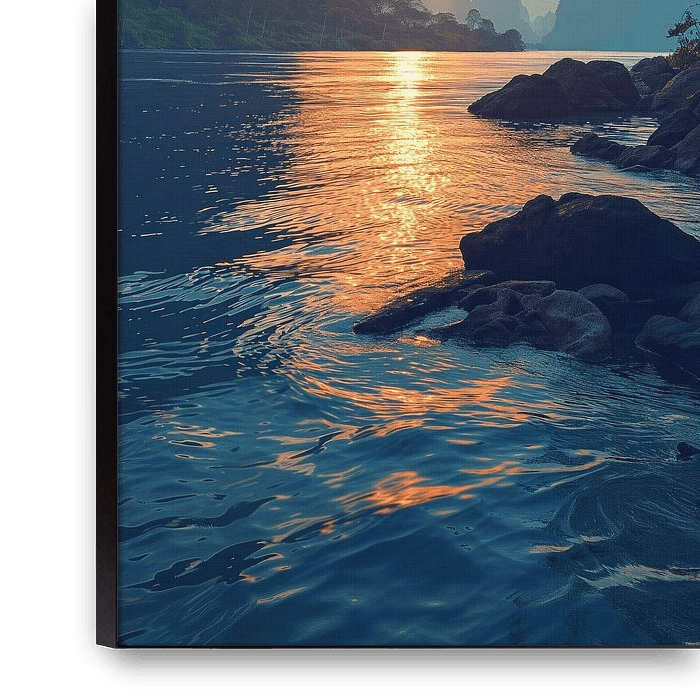 Die Steine am Ufer und die Silhouetten der tropischen Bäume bilden einen natürlichen Rahmen um die Szene und tragen zur ruhigen Atmosphäre…