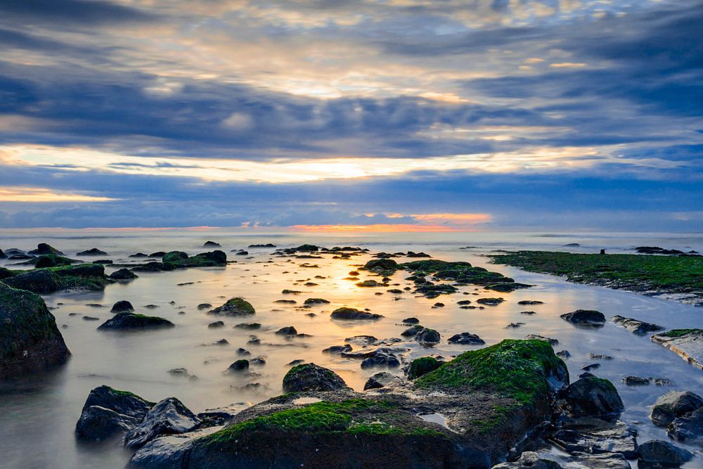Sonnenuntergang entlang der Nordsee mit einem typischen Wellenbrecher im Vordergrund und durch eine längere Verschlusszeit scheint es Bewegung in den Wellen zu geben, was dem Bild eine ruhige Atmosphäre verleiht.
