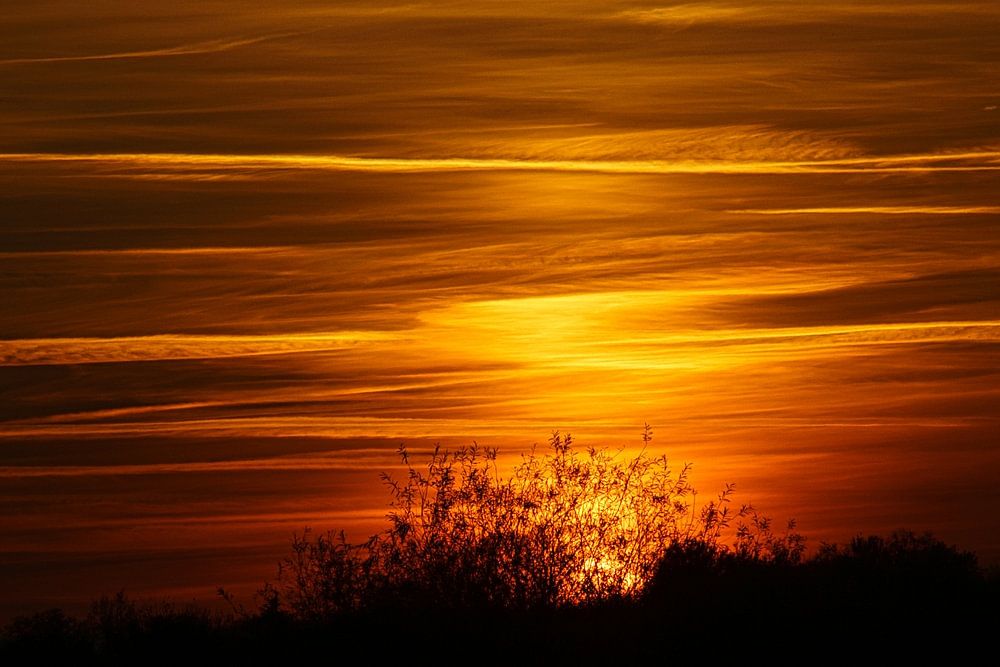 Sonnenuntergang hinter Bäumen. Abendliche Stimmung. Landschaft aus Deutschland