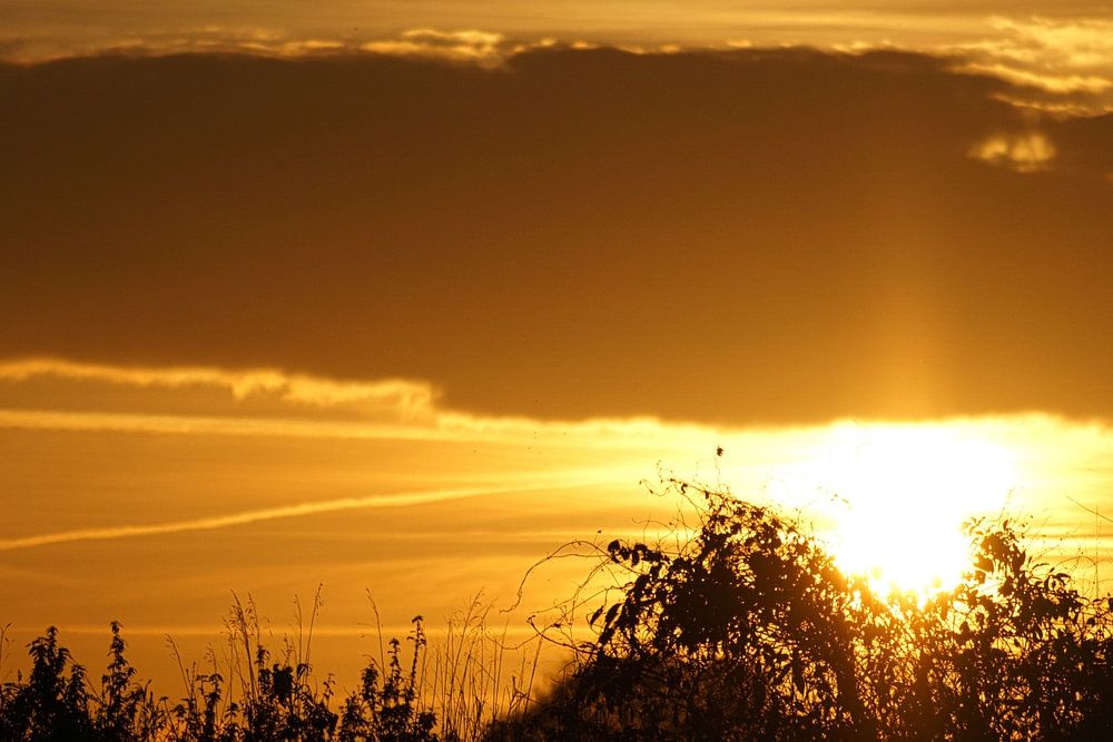 Sonnenuntergang hinter Bäumen. Abendliche Stimmung. Landschaft aus Deutschland