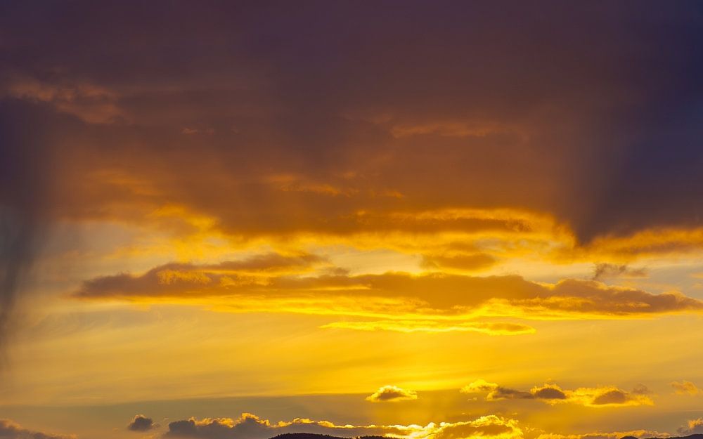 Die Sonne geht hinter den Anden in Chile unter. Es ist teilweise bewölkt, was dem Himmel eine besonders dramatische orange Farbe verleiht. Schauer ziehen vorbei und hinterlassen dunkle Flecken am Himmel. Das Wetter in Patagonien ist sehr wechselhaft, und das sieht man auf diesem Foto.