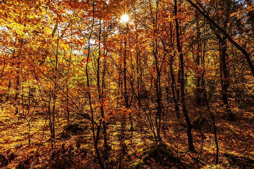 Bestelle dieses Landschafts-Wandbild Sonnenuntergang im Wald von Frank Herrmann als Reproduktion auf Leinwand, Alu-Dibond, als Poster, Fototapete oder Acrylglasbild.