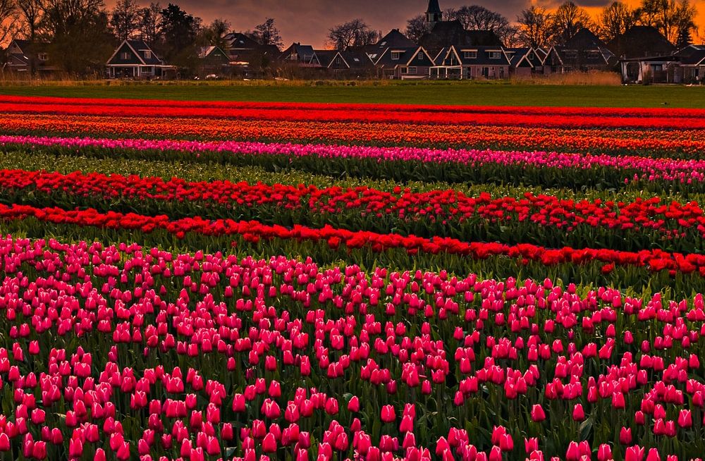 Tulpenfeld entlang der Hazeweel in Oostwoud. Mittwoch, 7. April 2021 mit ständig wechselndem und bedrohlichem Himmel. Die untergehende Sonne, die sich in den Wolken spiegelt, und der ständig wechselnde Himmel ergaben wunderschöne Bilder