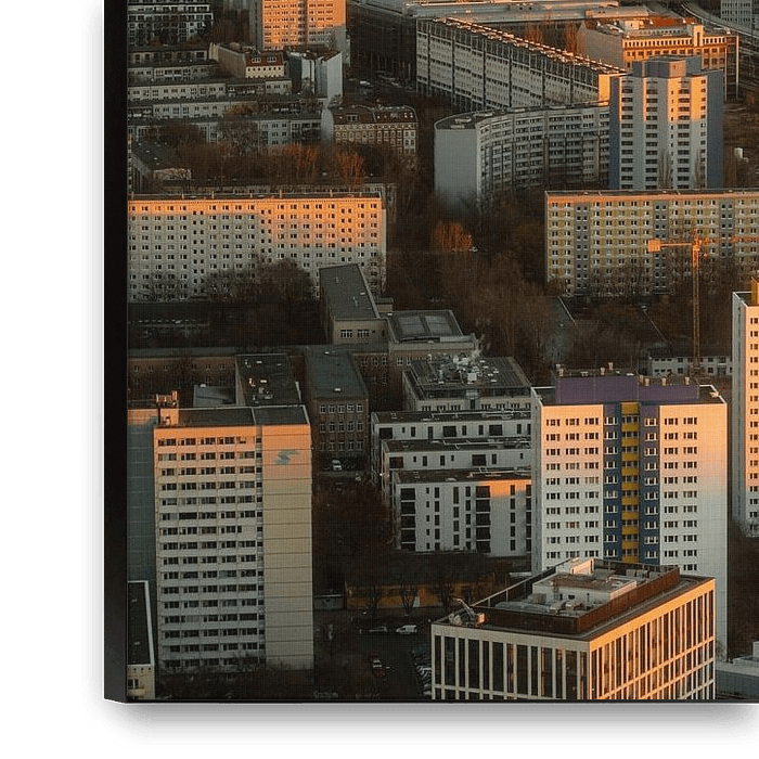 Bestelle das Foto Sonnenuntergang über Berlin vom Fernsehturm von Leo Schindzielorz als Reproduktion auf Leinwand, Alu-Dibond, als Poster, Fototapete oder Acrylglasbild.