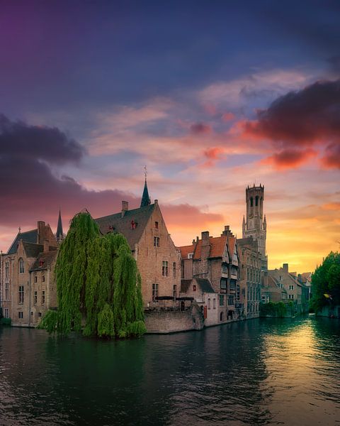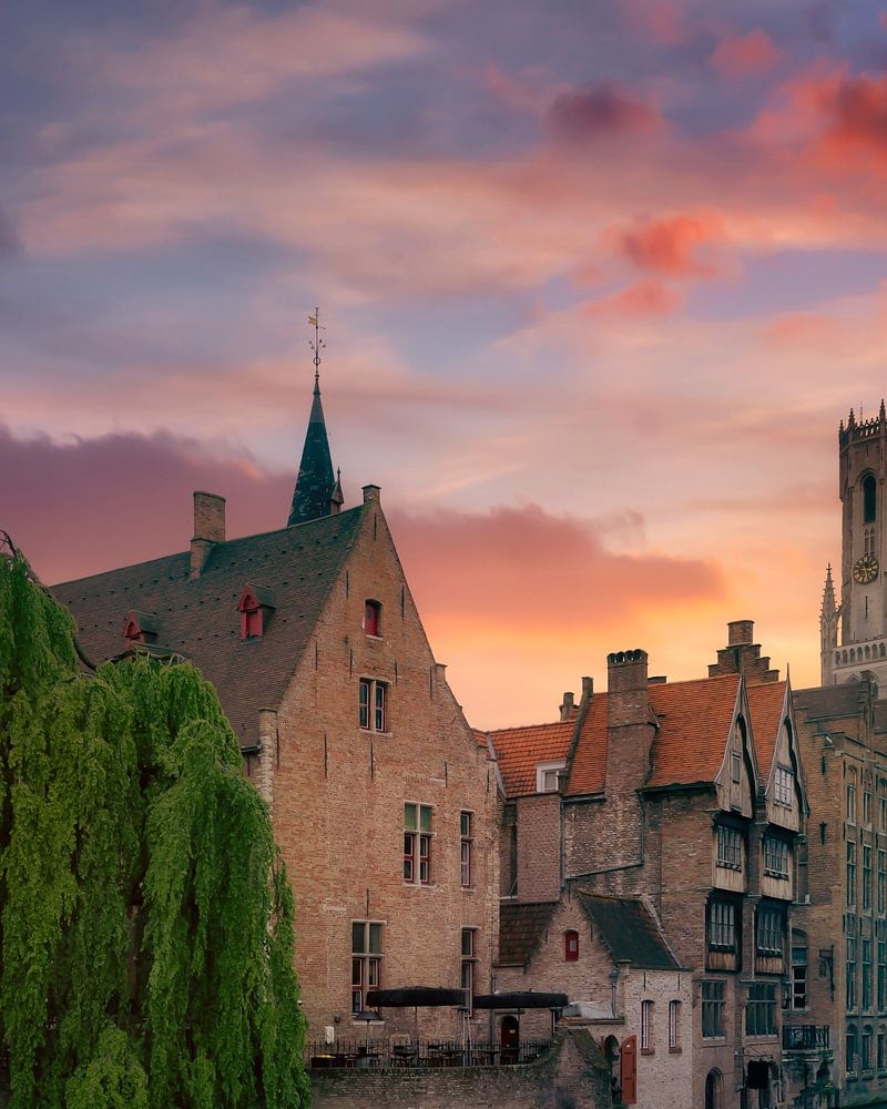 Schöner Sonnenuntergang über Brügge oder Brugge, Rozenhoedkaai, Rosenkranzkai, Blick auf den Wasserkanal. Region Flandern, Belgien, Europa