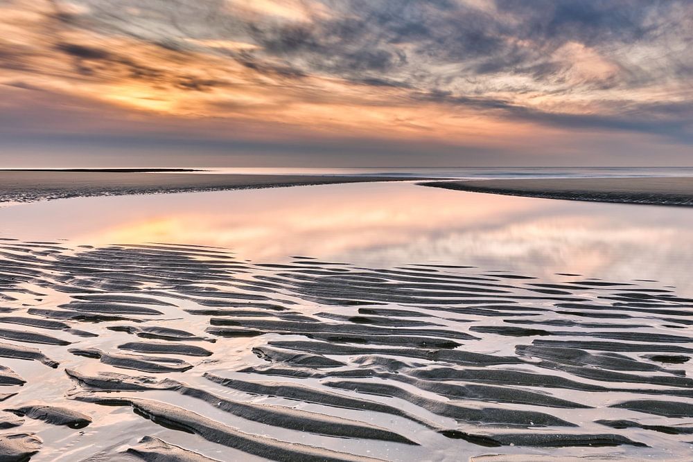 Hier, eine weitläufige Meereslandschaft. Die niederländische Küste mit Blick auf den Strand und die Nordsee bei Sonnenuntergang. Eine lange Verschlusszeit macht es zur digitalen Kunst. ( log Exposition ). Die digitale Küstenlinie der niederländischen Küste bei Ebbe. Im Vordergrund besondere Formen und Muster im Sand. Auch eine schöne Spiegelung der Wolken auf dem stillen Meerwasser.