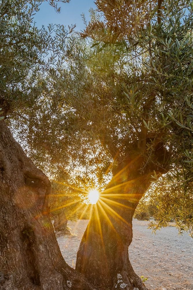 Sonnenuntergang zwischen Olivenbäumen mit Blick auf die Landschaft. Das Foto wurde in einem der vielen Olivenhaine in Zentralspanien in der Nähe von Madrid aufgenommen.