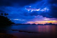 Die Sonne geht auf den Philippinen unter. Dieser tropische Sonnenuntergang bietet einen Kontrast von Farben und Specklicht.