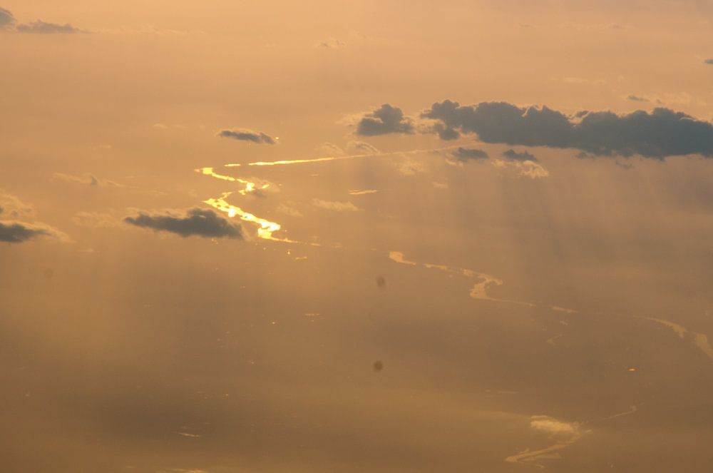 Vom Flugzeug nach Spanien hatte ich eine schöne Aussicht. Der Sonnenuntergang schuf ein schönes Ganzes mit Wolken und Licht. Die Flüsse sind glänzend. Du kannst komplett davon träumen.