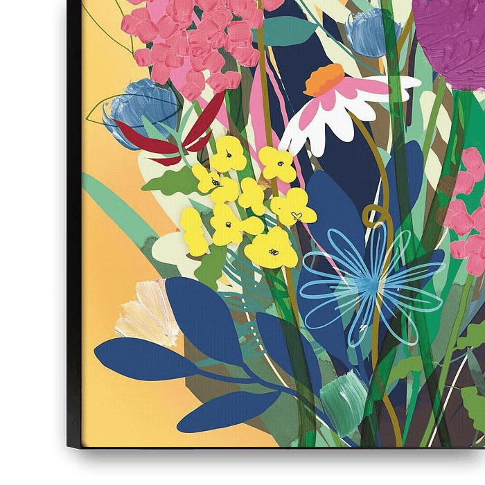 Ein Blumenstrauß im vollen Sonnenlicht vor gelbem Hintergrund. Dieser Blumenstrauß lässt die Sonne in Ihr Zuhause scheinen und ist ein schöner Blickfang an Ihrer Wand!