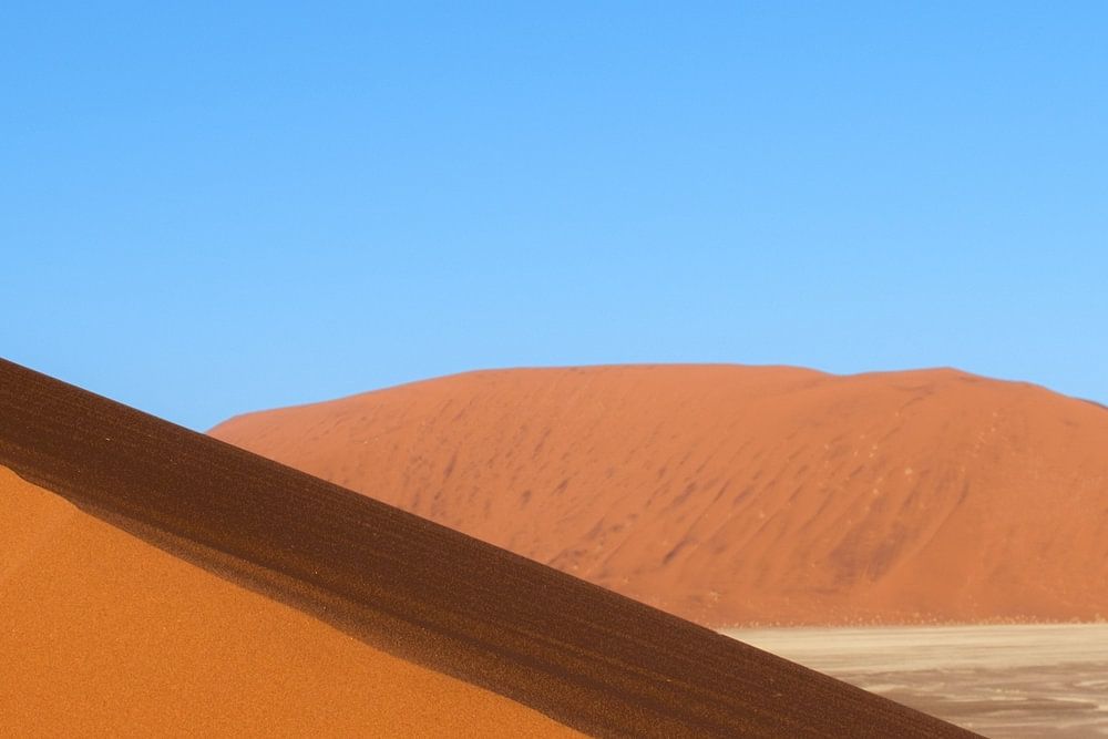 Detail der Dünenlandschaft Sossusvlei in Namibia. Gezeichnet nach einem harten Aufstieg von der Düne 45 auf unserer Fahrt zum Deadvlei. Einzigartige Landschaften mit Blick auf die höchsten Dünen der Welt.