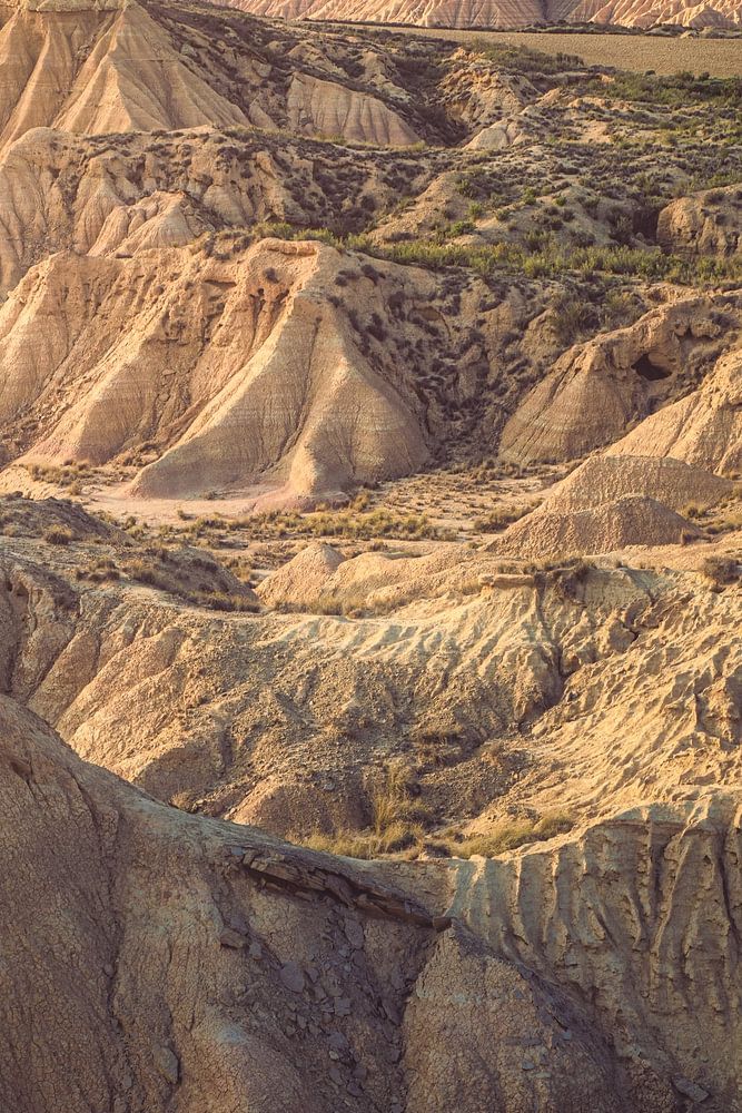 Einzelne Büsche und Sträucher setzen sich als dunkle Silhouetten vor dem farbenprächtigen Himmel ab. Die Stille der Wüstenlandschaft wird durch den sanften Wind durchbrochen, der leise über die Ebene streicht und das trockene Gras rascheln lässt. Der Kontrast zwischen dem warmen Glühen des Abendlichts und den schattigen Konturen der Felsen verleiht der Bardenas Reales eine mystische Atmosphäre. Es ist ein ruhiger Moment, in dem die Natur in ihrer rauen Schönheit zur Ruhe kommt und die Konturen der Landschaft von einem faszinierenden Zusammenspiel aus Licht und Schatten geprägt sind.