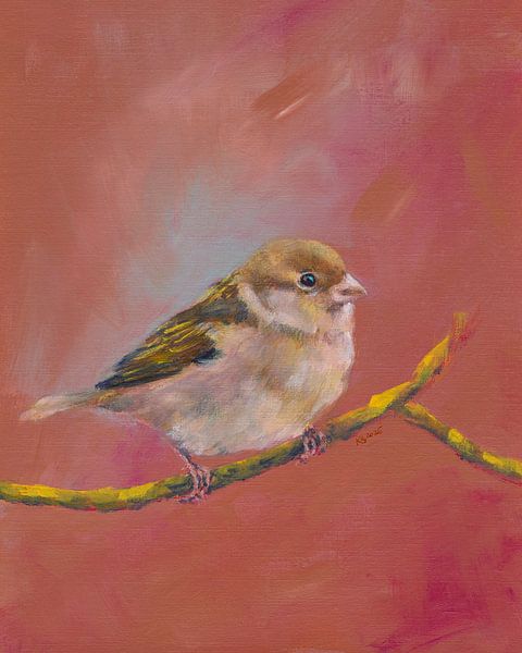 Ein weiblicher Sperling mit weichem, flauschigem Gefieder sitzt auf einem schlanken Ast. Der Vogel schaut nach rechts. Die zarten Federn des kleinen Vogels sind in verschiedenen Brauntönen mit lockeren, sanften Pinselstrichen gemalt. Der Hintergrund ist abstrakt in warmen Braun-, Lila- und Erdtönen gemalt.