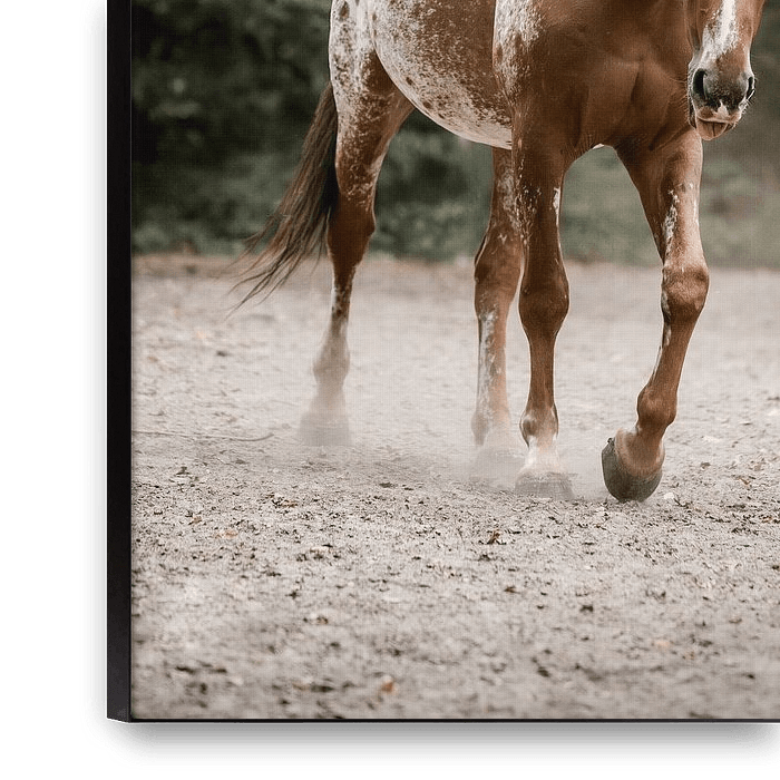 Diese bezaubernde Aufnahme zeigt ein geflecktes Pferd, das ruhig über einen staubigen Weg schreitet, eingefangen in einem subtilen Spiel des Sonnenlichts, das durch das Laub fällt. Die warmen Farbtöne des Fells heben sich im diffusen Licht wunderbar ab, so dass das Tier fast mit seiner Umgebung zu verschmelzen scheint. Die Kombination…