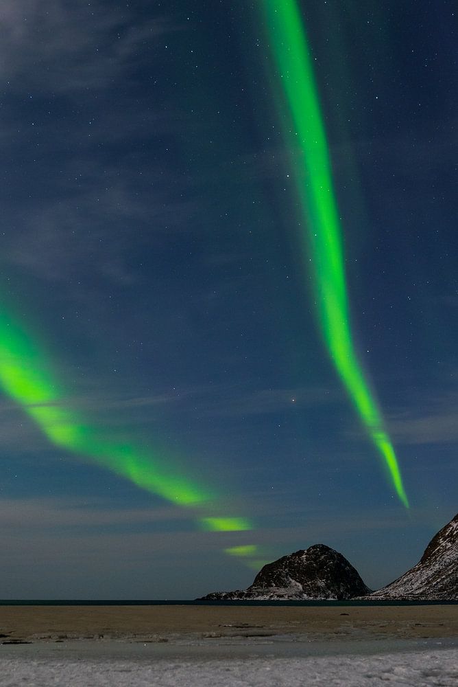 Spektakuläres tanzendes grünes starkes Nordlicht über dem berühmten runden Sandstrand bei Haukland auf den Lofoten in Norwegen in einer klaren Winternacht mit schneebedeckten Bergen