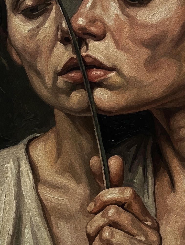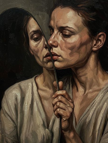 Bestelle diese Malerei Spiegel der Seele - Frau Selbstreflexion Ölgemälde von Ramy Salah Hefny als Reproduktion auf Leinwand, Alu-Dibond, als Poster, Fototapete oder Acrylglasbild.