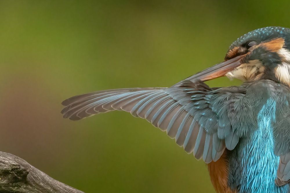 Zwischen dem Fischfang ist es auch wichtig, sein Gefieder in Ordnung zu halten. Auf einem Ast über dem Wasser putzt sich das Eisvogelweibchen die Federn, bevor es einen weiteren Tauchgang unternimmt.
