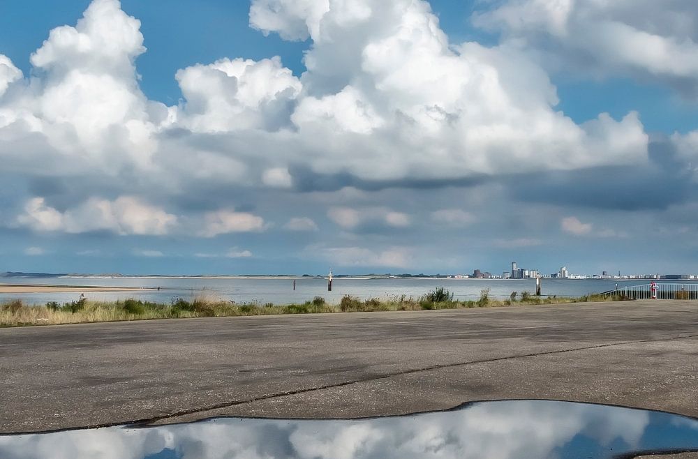Dieses Foto wurde an einem schönen, klaren und windstillen Sommertag in Zeeuws-Vlaanderen aufgenommen, und zwar in Breskens an der Westerscheldemündung. Nach dem Regen blieben auf der Uferpromenade Wasserpfützen zurück, in denen sich die schönen weißen Wolkenfelder spiegelten. Der Standort befindet sich in der Nähe des Anlegers der Fähre Breskens/Vlissingen. Im Hintergrund sieht man über die Westerschelde hinweg die Skyline von Vlissingen und die Dünen in Richtung Zoutelande.