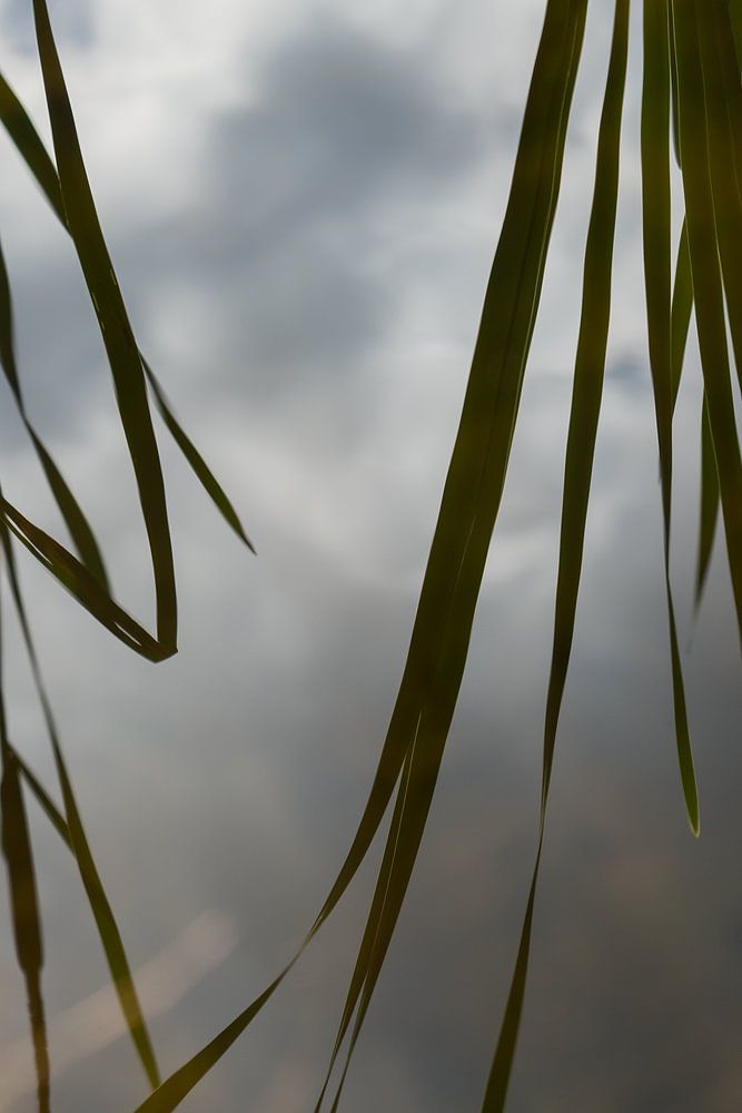 Weiche Wolken treffen auf Blätter und dezentes Sonnenlicht. Dunkelgrüne Schilfblätter und Wolken spiegeln sich auf der ruhigen Wasseroberfläche eines kleinen Sees. Naturfotografie in Sachsen, die sich der minimalistischen Wirkung von Spiegelungen im Wasser verschrieben hat.